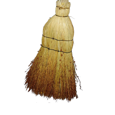 Escoba de rama de curaguilla con mango de madera liso perforado para colgar.